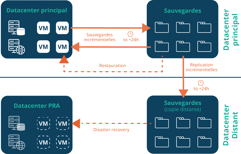Nous mettons à votre disposition une option PRA haute sécurité. Elle s’appuie sur la redondancede l’infrastructure et du stockage sur un datacenter distant et permet le déploiement simple et maîtrisé d’un PRA.